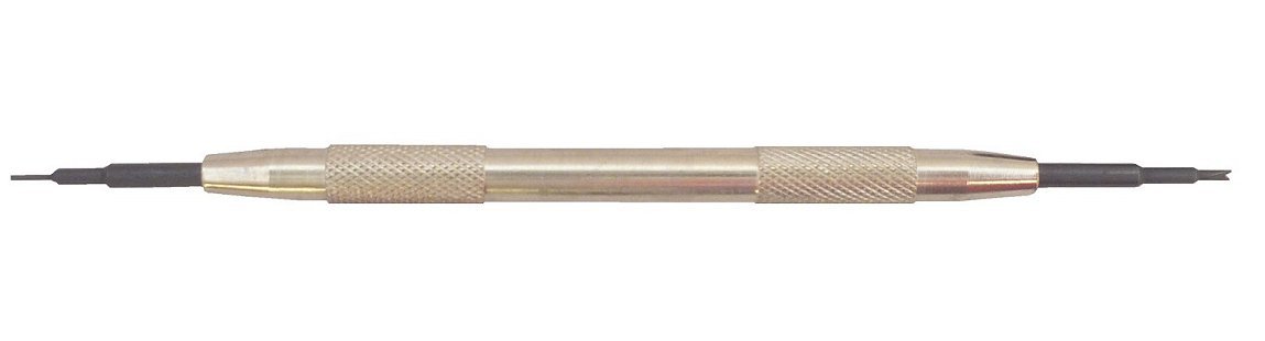 The spring bar removal tool is used for removing the spring bars which connect the watch strap to the watch shoulders. With leather or plastic straps, the forked end can be used to compress the spring bar, allowing the watch strap to be removed and replaced.