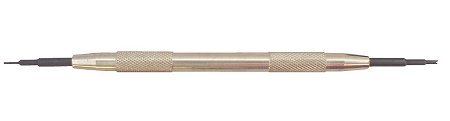 This metal version of the spring bar removal tool comes with a very fine forked end for use with small watch straps. The ends unscrew and the replacement end pieces can also be be used with this tool.